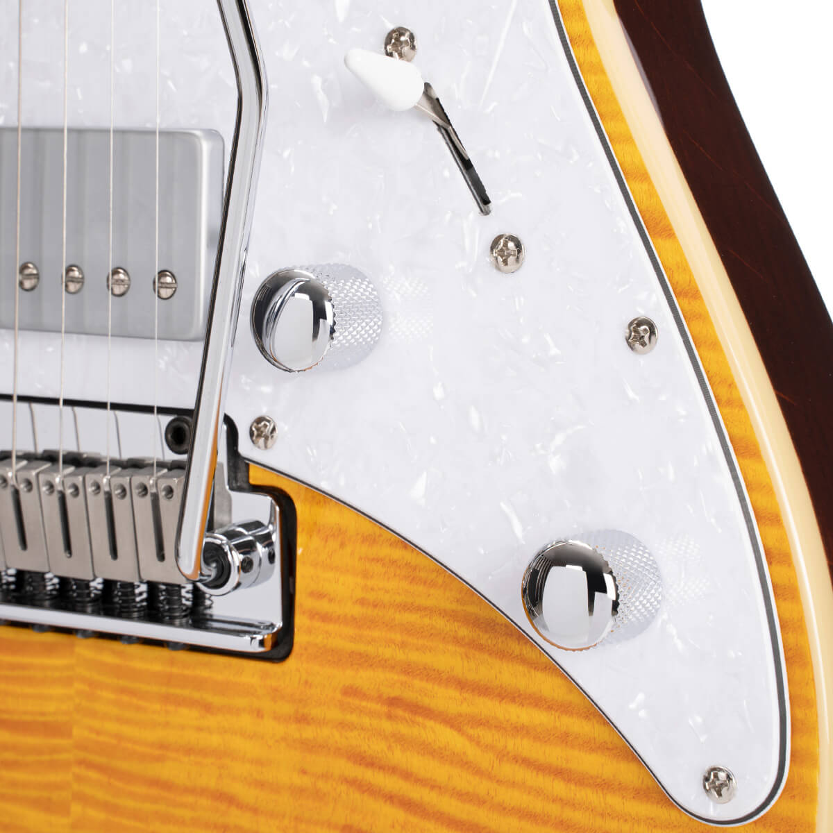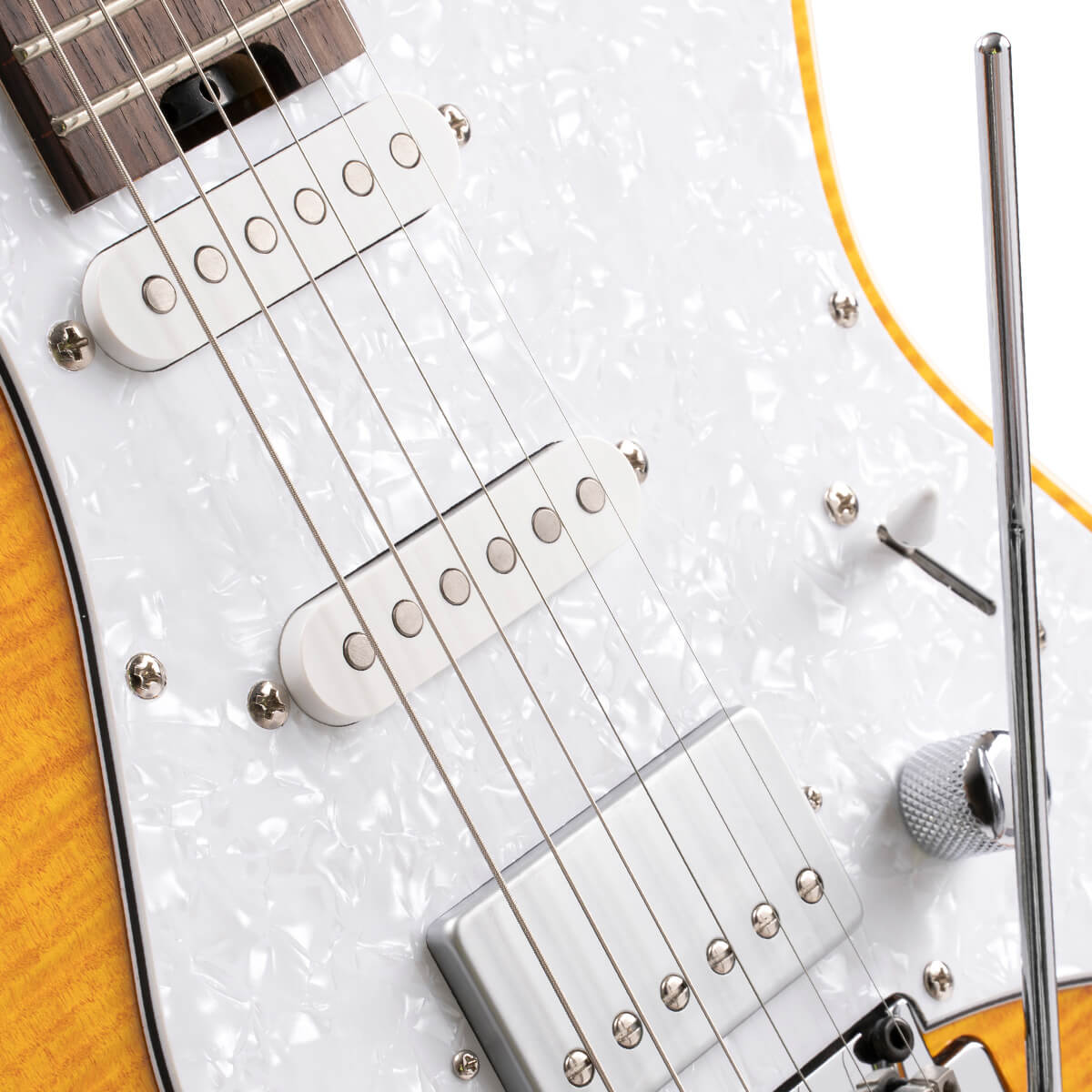 Alder gövde ve alevli akçaağaç üst kapak birleşimi, hem klasik hem de modern müzik türlerinde dengeli, güçlü ve karakterli bir ton sunar. HSS manyetik konfigürasyonu sayesinde sahnede ve stüdyoda geniş bir ton yelpazesi arayan gitaristler için çok yönlü bir çözüm oluşturur.