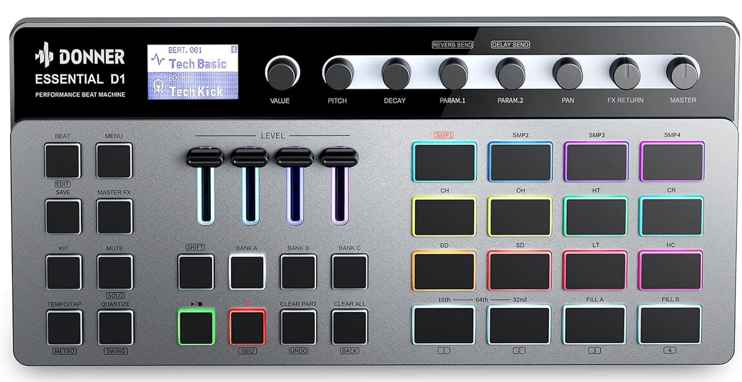 Donner Essential D1, modern elektronik müzik prodüksiyonunda hem sahne performansı hem de stüdyo çalışmaları için tasarlanmış güçlü ve akışkan bir groovebox’tır.