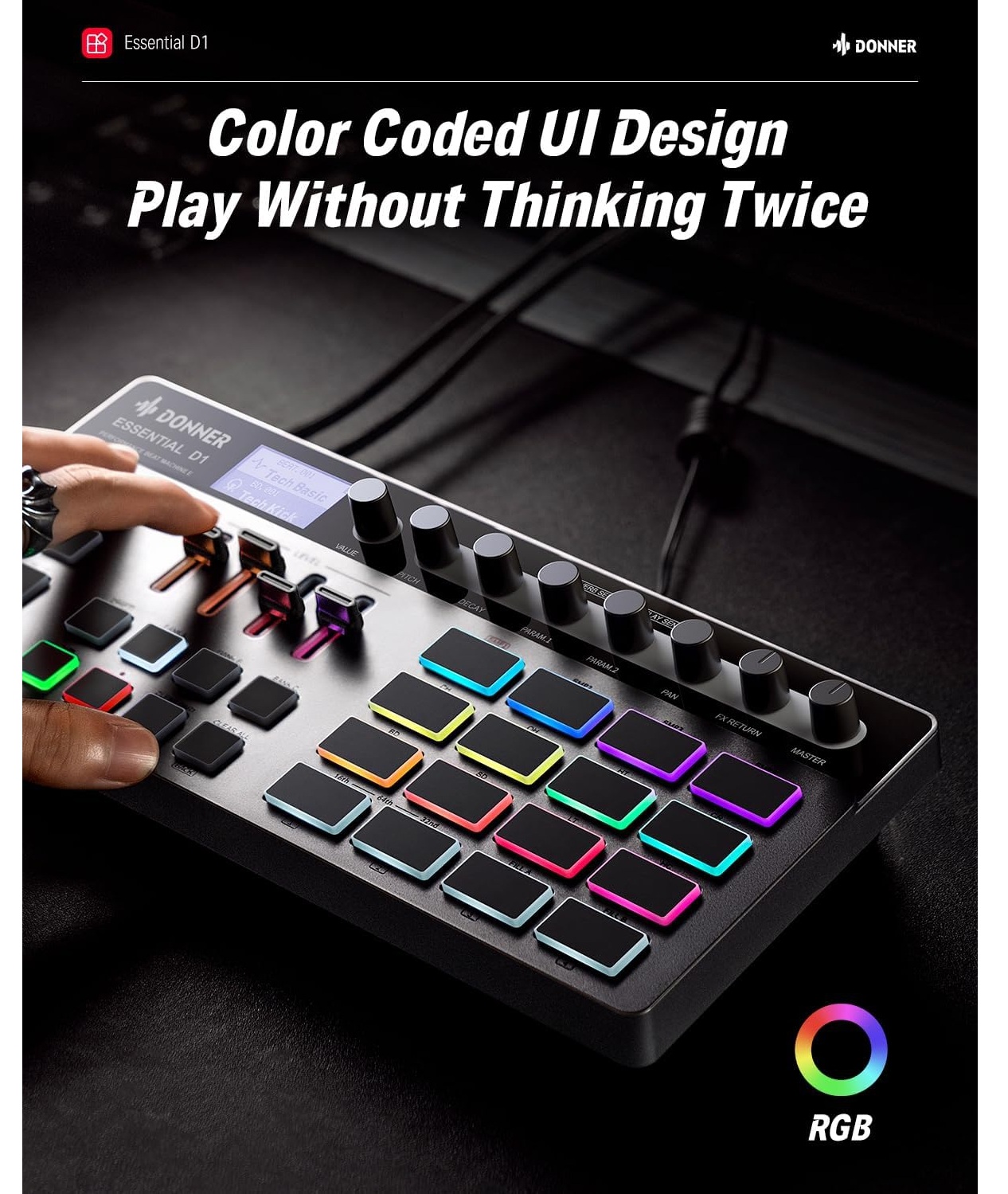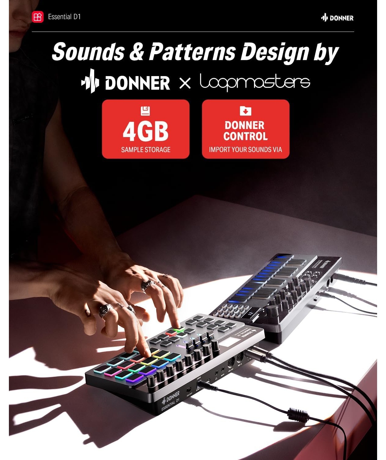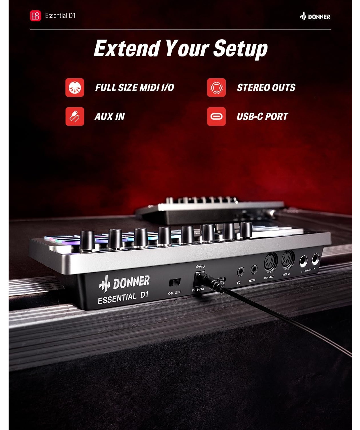 Donner Essential D1; elektronik müzik prodüktörleri, canlı performans sanatçıları, beat-maker’lar, DJ’ler, mobil prodüksiyon yapan içerik üreticileri ve kompakt bir groovebox ile hem sahnede hem stüdyoda hızlı, akıcı ve yaratıcı bir beat makinesi arayan tüm kullanıcılar için ideal bir çözümdür.