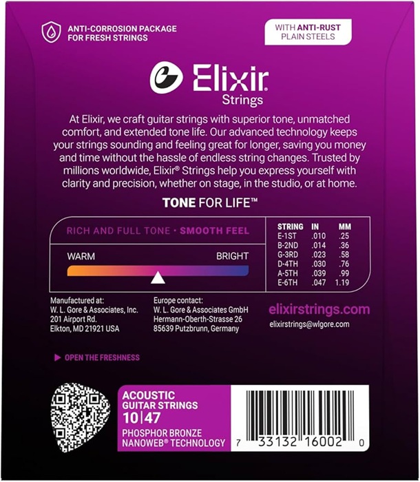 - NANOWEB Kaplama: Elixir tellerindeki özel kaplama, telleri ter, rutubet, paslanma, kirlenme ve metal yorgunluğu gibi dış etkenlerden koruyarak daha uzun ömürlü kullanım sağlar.