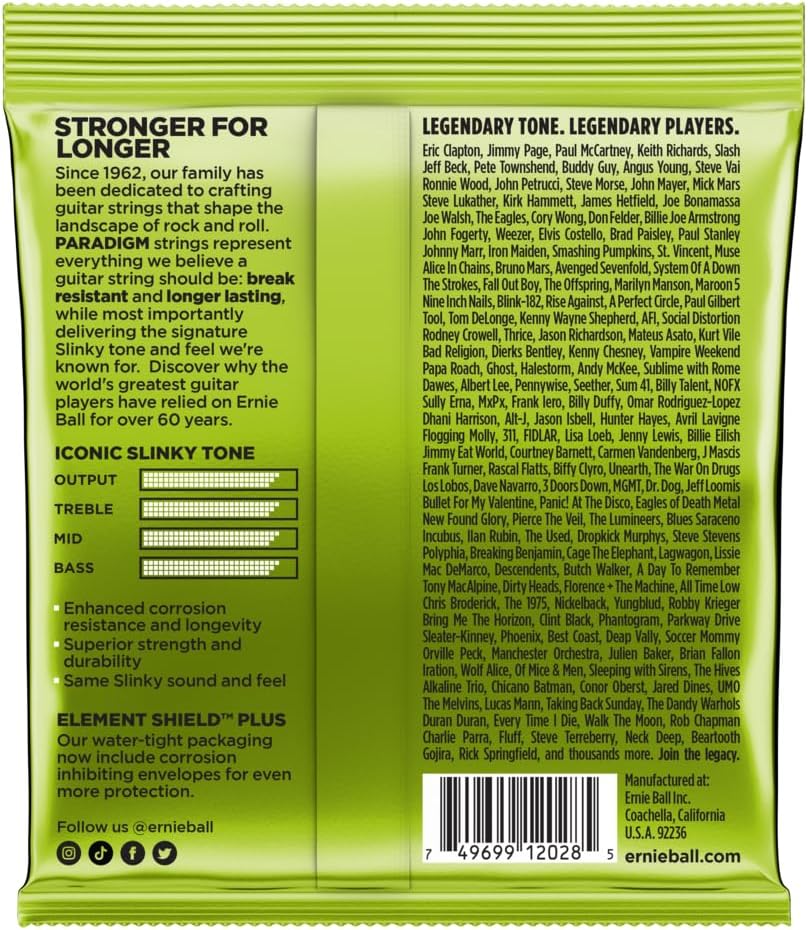 Ernie Ball Paradigm 2028, klasik Regular Slinky tonu ile maksimum dayanıklılığı birleştiren 7 telli elektro gitar teli setidir. Paslanmaya karşı özel işlenmiş yapısıyla ve plazma güçlendirmesiyle agresif çalım stillerine ve yoğun sahne kullanımına dayanıklıdır. John Petrucci ve Kenny Wayne Shepherd gibi ustaların testinden geçen bu teller, uzun ömürlü kullanım ve güvenilir performans sunar.