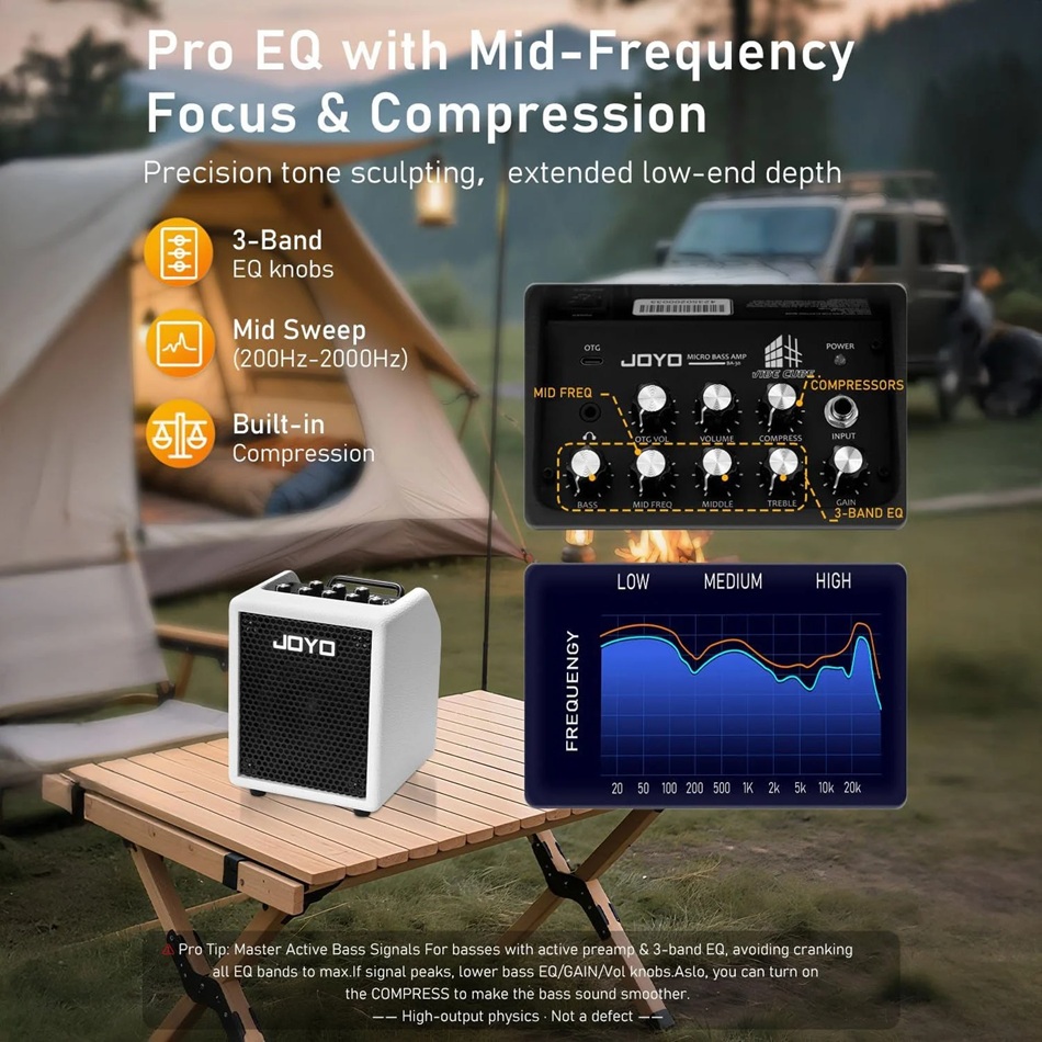 30 W çıkış gücü ve 4 inç tam aralıklı hoparlörüyle net ve kontrollü bir bas tepkisi sunarken, 3 bant EQ ve ayarlanabilir orta frekans kontrolü sayesinde tonu son derece hassas biçimde şekillendirmenize imkân tanır. Dahili kompresör devresi atakları yumuşatır, düşük seviyeli notaları dengeler ve daha dolgun bir bas karakteri sağlar.
