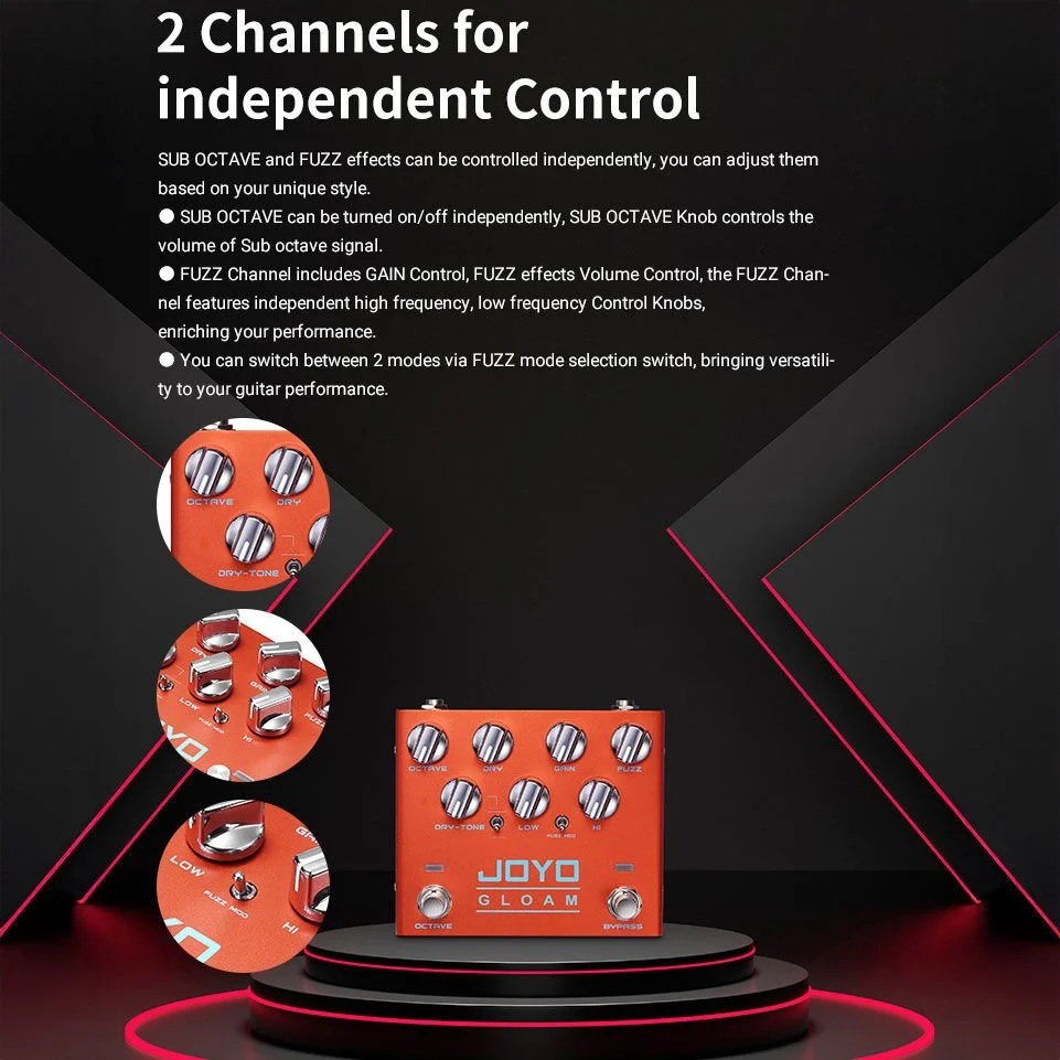 Joyo R-29 GLOAM, bas gitaristler için özel olarak tasarlanmış, Sub Octave ve Fuzz efektlerini tek bir pedalda birleştiren güçlü ve esnek bir efekt çözümüdür. Sub Octave ve Fuzz kanallarının birbirinden bağımsız olarak kontrol edilebilmesi sayesinde tonunuzu tamamen kendi çalım tarzınıza göre şekillendirebilirsiniz.