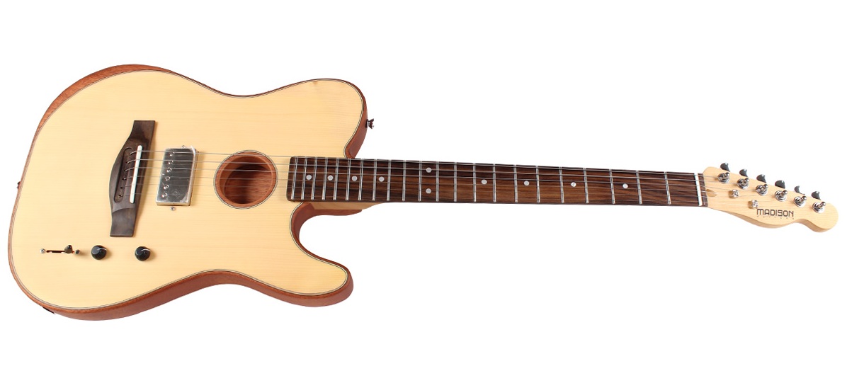Madison MEAG-TL01-N, elektro akustik gitar dünyasında farklı bir tasarım yaklaşımıyla öne çıkan şık bir modeldir. Telecaster tarzı gövde formunu doğal ahşap görünümüyle birleştiren bu gitar, hem klasik akustik tınıyı hem de sahnede amfiye bağlanabilme avantajını bir araya getirir.